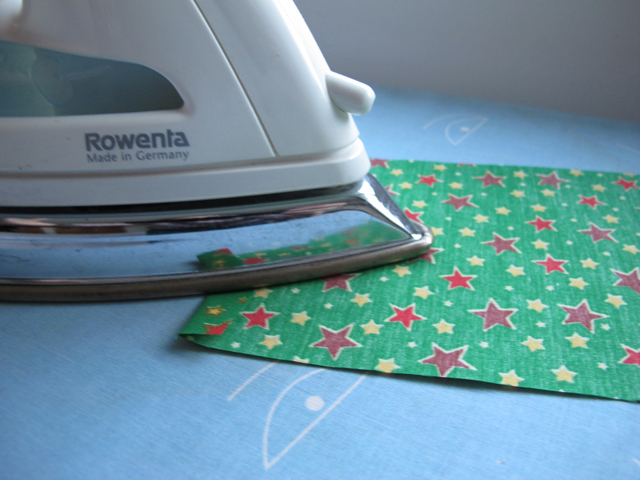 That's the backing done. On to the pockets. First we are ironing our pockets ready to hem them and sew them on later. Fold over the short edges of each piece and iron.